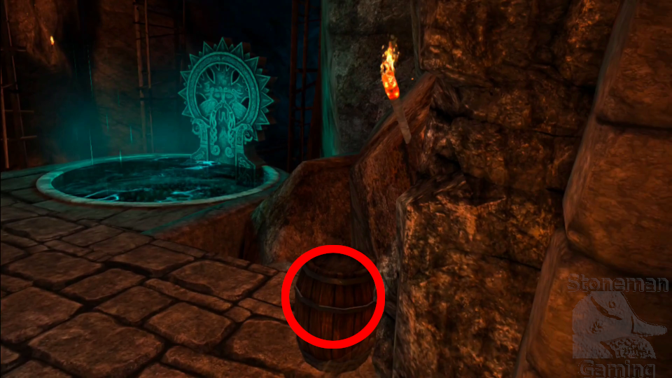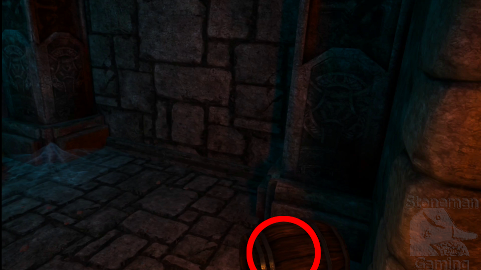 - This is moved in the PSVR2 version. On the second landing, face the fountain. Turn left and move over the rubble into a small alcove to find this barrel.