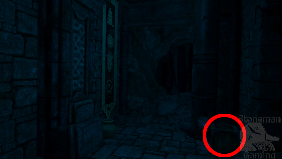 - On the first landing, smash the crate immediately to the left of the top of the stairs and the pot beside the Odin pedestal.